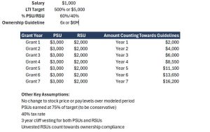 As a result, executives can typically meet existing ownership requirements with fewer than two years of equity grants, assuming reasonable performance outcomes and no major stock price decline.