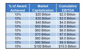 • Performance Only Vesting: Vesting is strictly tied to meeting both market capitalization and cumulative EBITDA goals; no discretionary adjustments are permitted.