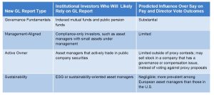 GL’s change in practice also aligns with what ISS has done for several years. ISS issues a “benchmark” report, along with Socially Responsible Investing, Taft-Hartley, Faith-based, Climate, Public Fund and Sustainability reports. The “benchmark” report is based upon ISS’s standard proxy voting policies and therefore the one that heavily influences investor voting behavior.