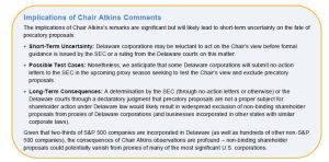His remarks suggest that there is a sound basis under which these proposals may be excluded from proxy statements of Delaware corporations – a position that, if adopted, could upend historical shareholder engagement practices related to shareholder proposals.