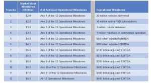 For example, Mr. Musk would earn the first tranche of the CEO Performance Award if Tesla met the $2 trillion market value milestone when paired with the achievement of the delivery of 1 million robots. The $400 billion adjusted EBITDA goal may be paired with three separate market value milestones which would result in Mr. Musk earning three tranches of the CEO Performance Award.