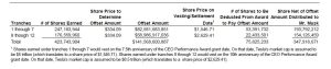 Mr. Musk will be required to pay to Tesla an “offset amount” upon the vesting of earned shares. To pay this amount, Tesla shares with a fair market value equal to this offset amount will be deducted from Mr. Musk’s earned shares (with the fair market value of such shares based on share price on the applicable vesting anniversary date). The offset amount is equal to the product of $334.09 per share and the number of shares earned. Mr. Musk may choose to pay the offset amount in cash.