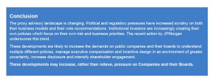 These regulatory headwinds add to a developing shift which saw large institutional investors develop and follow their own proxy voting policies which align their voting decisions with bespoke investment and risk-management goals. This has had three impacts on proxy voting: